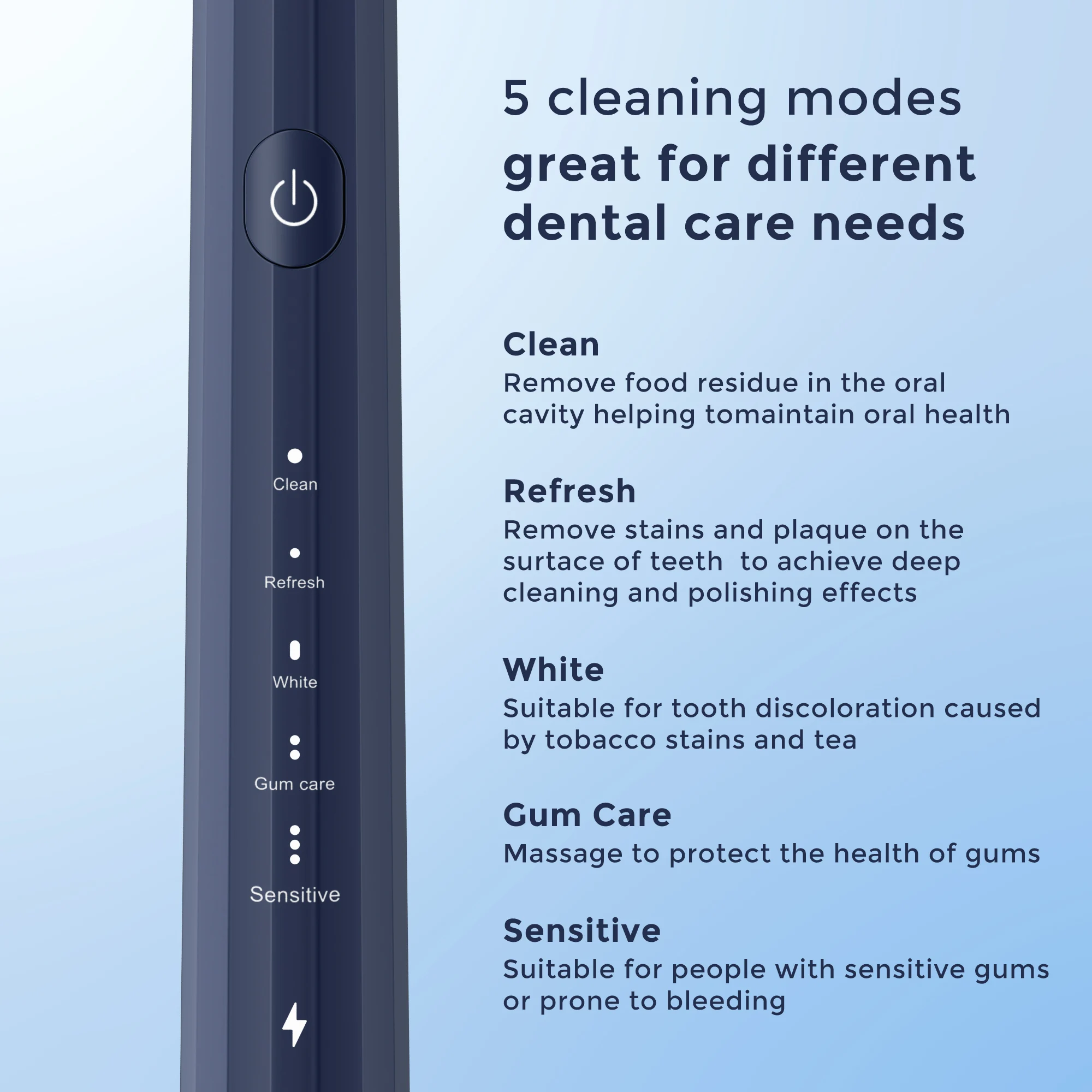 【5 Modes for Various Oral Care Needs】4 high-performance modes are designed to meet all your oral care needs and help maintain a healthy mouth. Whitening, Clean, Soft, Massage.100% teeth stain removing and teeth spot dislodging on teeth. Clean mode goes deep into the inter dental, cleans the dirt hidden in the periodontal. While massage mode offers a gentle massage of gums.